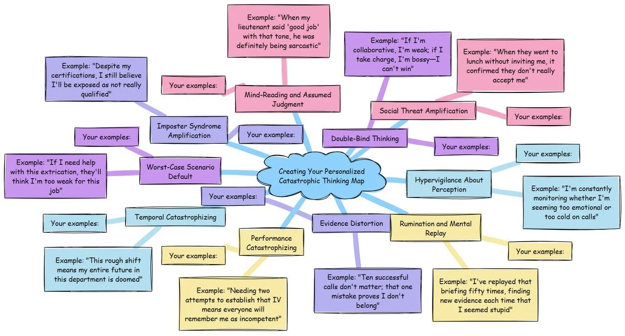 This self-assessment is designed to help female first responders identify, understand, and develop effective responses to catastrophic thinking patterns—those automatic mental processes that jump to worst-case scenarios and interpret neutral situations as threatening. While hypervigilance and threat assessment are essential skills on emergency scenes, when these patterns extend into every aspect of professional and personal life, they create unnecessary suffering and can undermine both performance and wellbeing.
